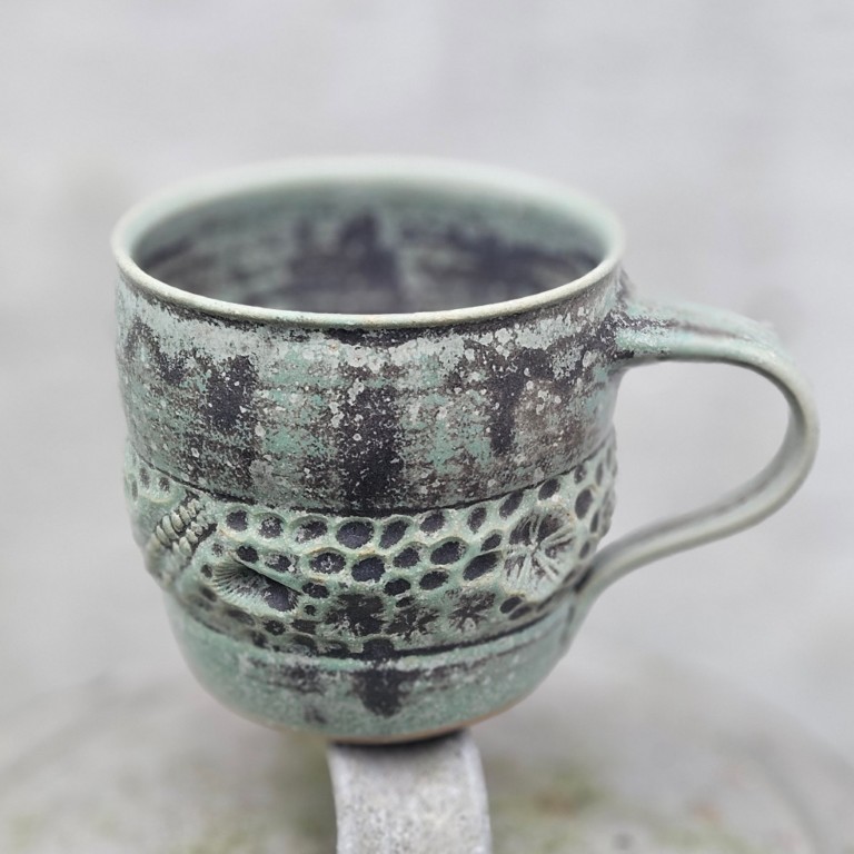 Fossilkopperne er inspireret af ting, jeg finder ved stranden. Jeg har boet ved vandet hele mit liv og kan ikke lade være med at kigge ned, når jeg går tur ved stranden. Søpindsvin og andre fund fra strandturene præger fossilkopperne – helt konkret, da jeg bruger stenene til at trykke ind i det våde ler, kort tid efter koppen er drejet.
