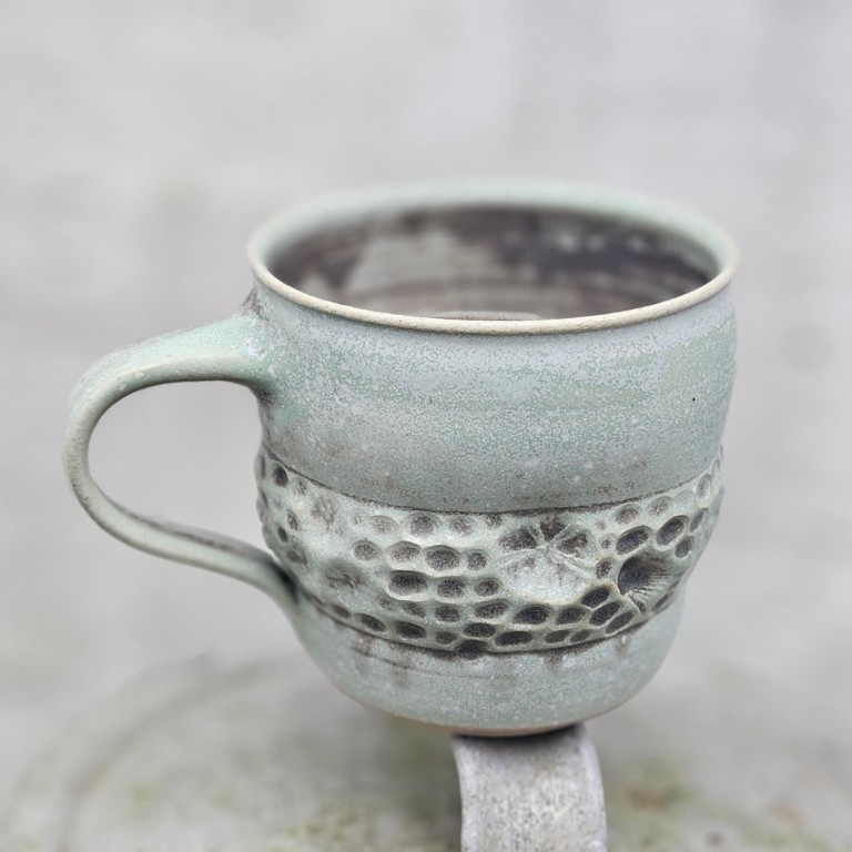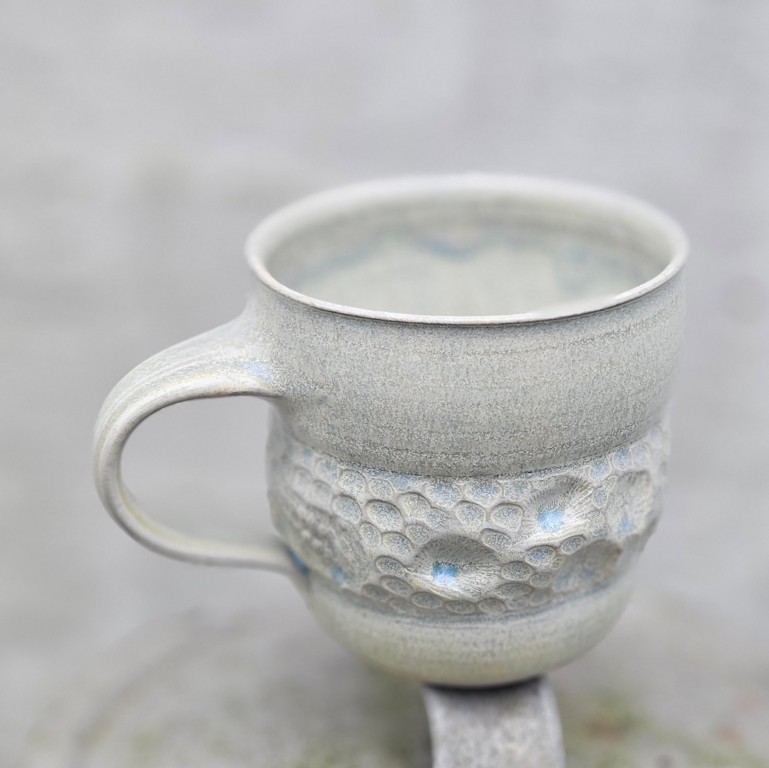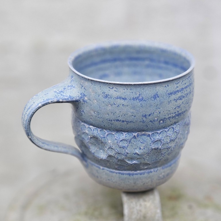 Kopperne er hånddrejede og ligeledes prægede i hånden af mig og mønstrene vil variere, du kan derfor ikke forvente at din kop er fuldstændig magen til den, du ser på billedet. Kopperne glaseres i tre forskellige nuancer. Glasurene er udviklet af mig med et ønske om at ramme farvenuancerne man ser ved havet.