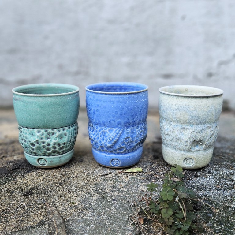 Fossilserien er inspireret af ting, jeg finder ved stranden. Jeg har boet ved vandet hele mit liv og kan ikke lade være med at kigge ned, når jeg går tur ved stranden. Søpindsvin og andre fund fra strandturene præger fossilserien – helt konkret, da jeg bruger stenene til at trykke ind i det våde ler, samt som inspiration når jeg modellerer de små søpindsvin, som sættes på keramikken.