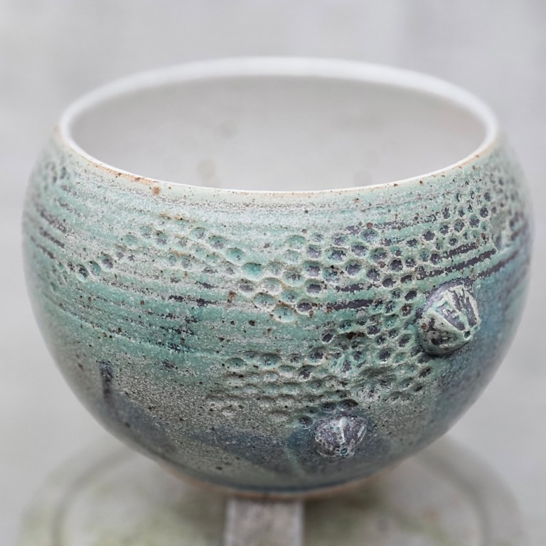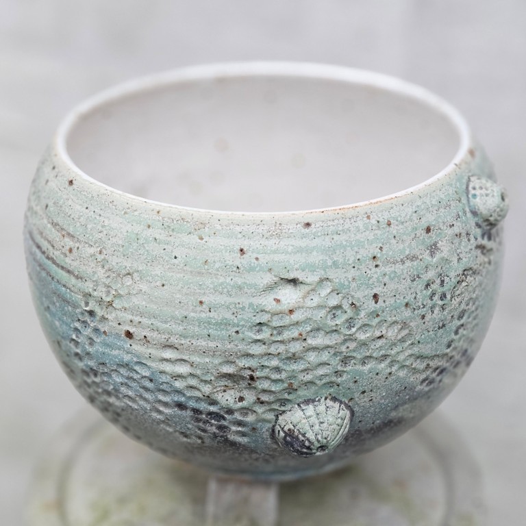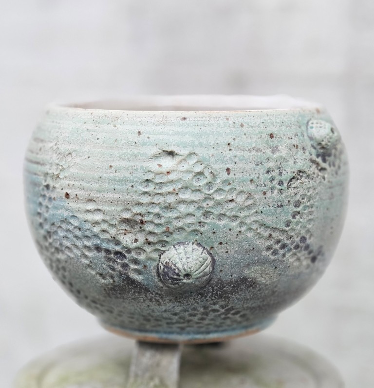 Fossilserien er inspireret af ting, jeg finder ved stranden. Jeg har boet ved vandet hele mit liv og kan ikke lade være med at kigge ned, når jeg går tur ved stranden. Søpindsvin og andre fund fra strandturene præger fossilkrukkerne – helt konkret, da jeg bruger stenene til at trykke ind i det våde ler, kort tid efter krukken er drejet.