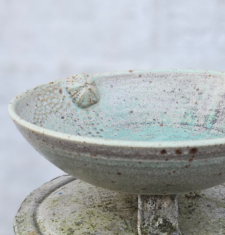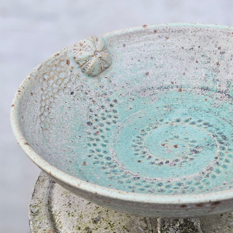 Her får du en medium skål. Skålen er hånddrejet i lavaler og præget i hånden af mig. Foruden aftryk af søpindsvin og strandsten er skålen dekoreret små modellerede søpindsvin.
