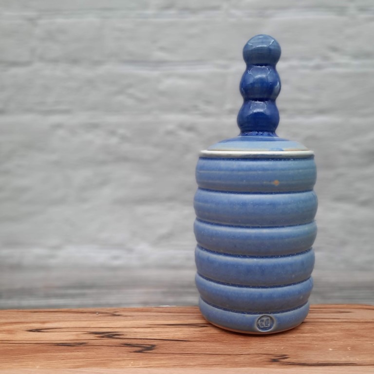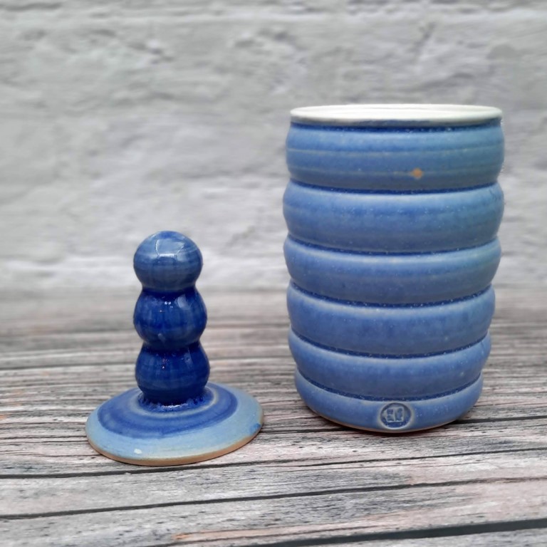 En helt unik krukke med låg. Hånddrejet i stentøjsler, højtbrændt så krukken er fuldt funktionel – men hvad du har lyst til at komme i den, det er helt op til dig selv 😀 Krukken er helglaseret og den kan vaskes i opvaskemaskine så du kan roligt bruge den til noget i dit køkken. Eller måske til småting i badeværelset? Eller blot som pynt i din reol.